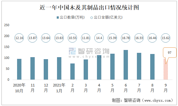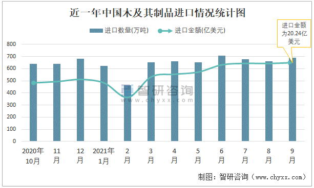 根據中國海關數據顯示:2021年9月中國木及其制品進口數量為691萬噸,同比下降4.6%,進口金額為20.24億美元,同比增長17.3%,2021年9月中國木及其制品出口數量為97萬噸,同比增長2.4%,出口金額為15.62億美元,同比增長27.4%;2021年1-9月中國木及其制品進口數量為5785萬噸,進口金額為158.29億美元,出口數量為981萬噸,出口金額為130.94億美元。
