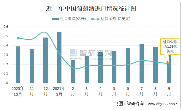 2021年9月中國(guó)葡萄酒進(jìn)口數(shù)量和進(jìn)口金額分別為0.36億升和1.39億美元