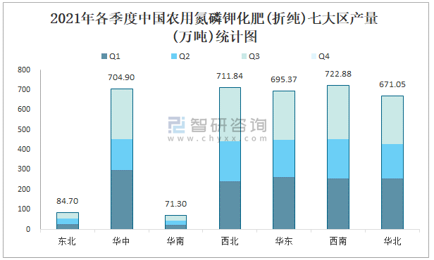 根據國家統計局數據顯示:2021年各季度中國農用氮磷鉀化肥(折純)主要集中在西南、西北、華東地區生產;2021年1-9月中國農用氮磷鉀化肥(折純)產量大區分布不均衡,其中西南地區產量最高,特別是貴州省貢獻了最多產量;2021年1-9月中國農用氮磷鉀化肥(折純)各省市產量呈現梯隊式分布,湖北、青海、山東等省產量最多。
