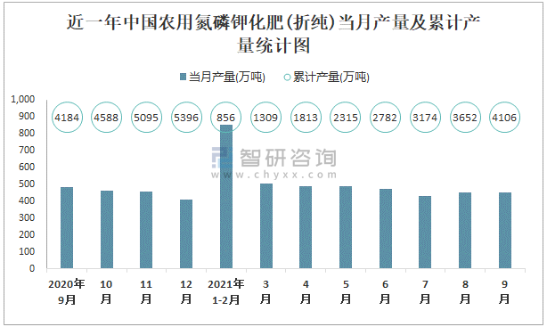 根據國家統計局數據顯示:2021年9月中國農用氮磷鉀化肥(折純)產量為452萬噸,同比下降4.8%;2021年1-9月中國農用氮磷鉀化肥(折純)累計產量為4106.1萬噸,累計增長1.2%;2015-2020年中國農用氮磷鉀化肥(折純)產量2015年達到最高,此后總體呈現下降趨勢。