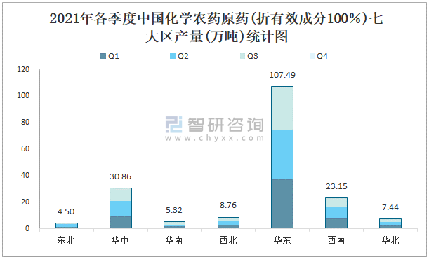 2021年各季度中國化學農藥原藥(折有效成分100%)七大區產量統計圖