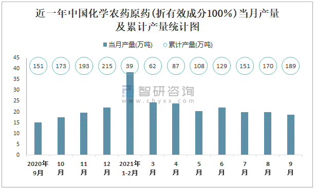 根據國家統計局數據顯示:2021年9月中國化學農藥原藥(折有效成分100%)產量為18.7萬噸,同比增長10%;2021年1-9月中國化學農藥原藥(折有效成分100%)累計產量為189.4萬噸,累計增長11%;2015-2020年中國化學農藥原藥(折有效成分100%)產量2016年達到最高,此后總體呈現下降趨勢。