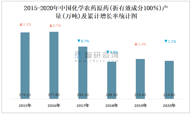2015-2020年中國化學農藥原藥(折有效成分100%)產量及累計增長率統計圖
