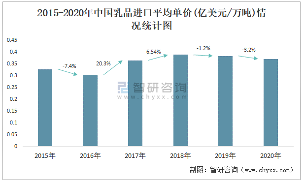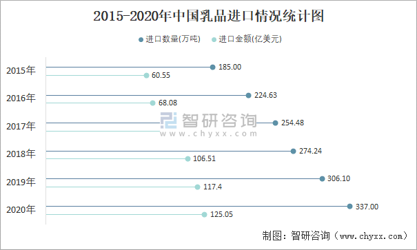 2015-2020年中國乳品進口情況統計圖