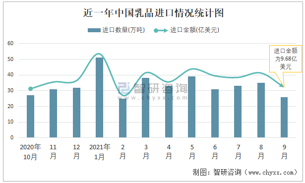 近一年中國乳品進口情況統計圖