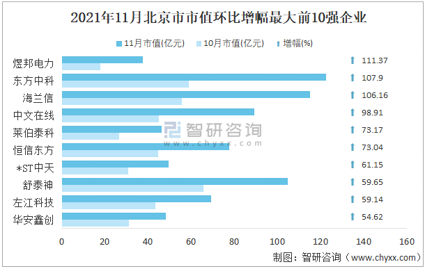 2021年11月北京市A股上市企業市值環比增幅最大前10強企業