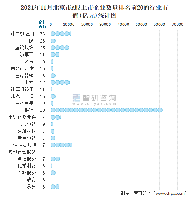 據同花順統計數據可知:北京市的A股上市企業涵蓋67個行業,其中從事計算機應用行業的企業最多,有73家,占全省A股上市企業數量比重為17.3%;銀行的總市值最高,其總市值為62089.65億元,占全省A股上市企業總市值比重為32.32%。