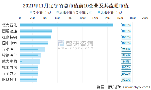 2021年11月遼寧省A股上市總市值前10強企業(yè)及其流通市值