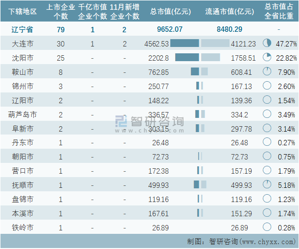 2021年11月遼寧省下轄地區(qū)A股上市企業(yè)情況統(tǒng)計表