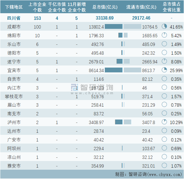 2021年11月四川省新增5家A股上市企業,153家企業總市值共計33138.69億元