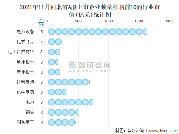 2021年11月河北省A股上市企業數量排名前10的行業市值(億元)統計圖