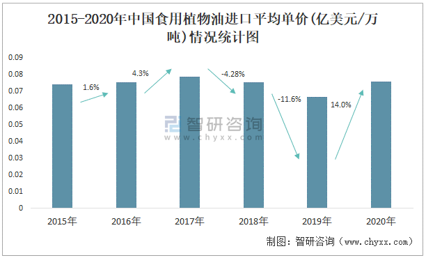 2015-2020年中國(guó)食用植物油進(jìn)口平均單價(jià)(億美元/萬(wàn)噸)情況統(tǒng)計(jì)圖