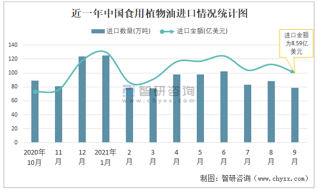 根據(jù)中國(guó)海關(guān)數(shù)據(jù)顯示:2021年9月中國(guó)食用植物油進(jìn)口數(shù)量為79萬(wàn)噸,同比下降23.6%,進(jìn)口金額為8.59億美元,同比增長(zhǎng)10.5%,2021年1-9月中國(guó)食用植物油進(jìn)口數(shù)量為829萬(wàn)噸,進(jìn)口金額為84.14億美元。