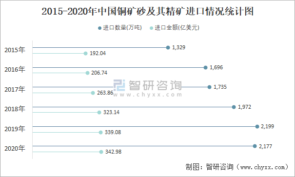 2015-2020年中國銅礦砂及其精礦進口情況統(tǒng)計圖