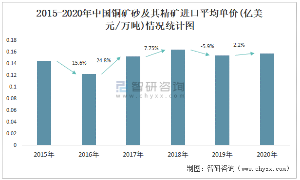 2015-2020年中國銅礦砂及其精礦進口平均單價(億美元/萬噸)情況統(tǒng)計圖