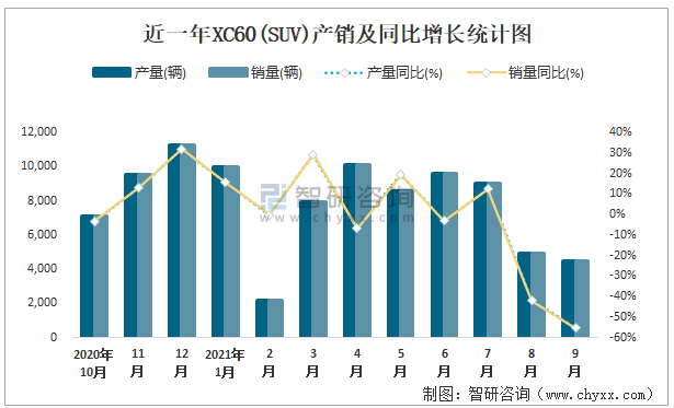 近一年XC60(SUV)產(chǎn)銷及同比增長(zhǎng)統(tǒng)計(jì)圖