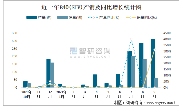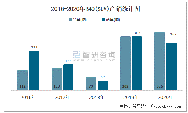根據中國汽車工業協會數據可知:2021年9月B40(SUV)產量為309輛,同比下降0%,銷量為58輛,同比增長314.3%,當月產銷率為18.77%;2021年1-9月B40(SUV)累計產量為1069輛,同比下降0%,累計銷量為496輛,同比下降0%,累計產銷率為46.4%;2016-2020年B40(SUV)產銷量均在2018年跌至最低值,此后有所增長,且近5年總銷量大于總產量,清倉庫存50輛。