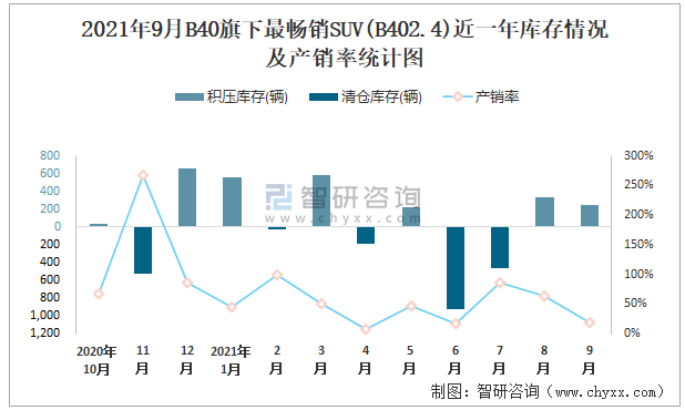 2021年9月B40旗下最暢銷SUV(B402.4)近一年庫存情況及產銷率統計圖