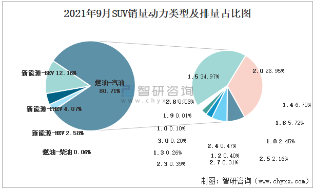 動力為燃油-汽油的SUV仍為銷售的主要車型,占比80.71%,其中1.5排量的燃油SUV較為暢銷;2021年9月新能源-BEV的SUV銷售占比12.16%,是最暢銷的新能源SUV,其他兩款新能源PHEV、HEV的SUV也占有少量市場份額,相較于新能源轎車(BEV、PHEV、HEV三款新能源轎車2021年9月銷量占有27.21%的市場份額),新能源SUV市場占有份額還有提升空間;隨著國家對新能源汽車政策扶持力度的加大、核心技術的升級、基礎設施的完善,未來新能源汽車將成為汽車產業轉型發展的主要方向。