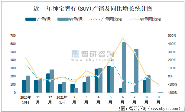 近一年紳寶智行(SUV)產銷及同比增長統計圖