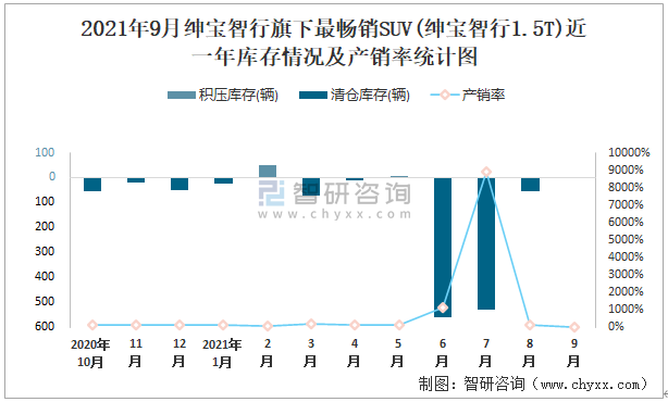 2021年9月紳寶智行旗下最暢銷SUV(紳寶智行1.5T)近一年庫存情況及產銷率統計圖