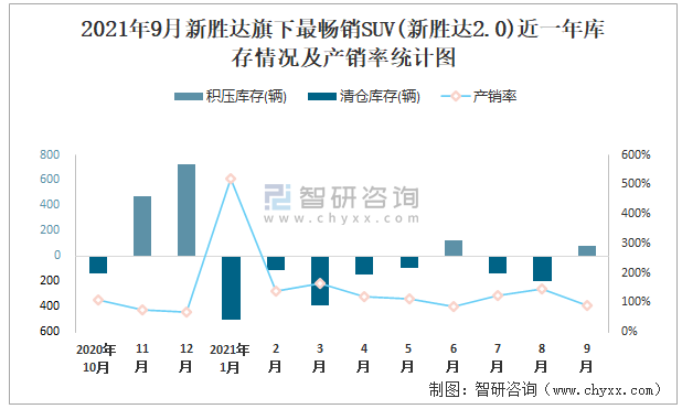 2021年9月新勝達(dá)旗下最暢銷SUV(新勝達(dá)2.0)近一年庫存情況及產(chǎn)銷率統(tǒng)計圖