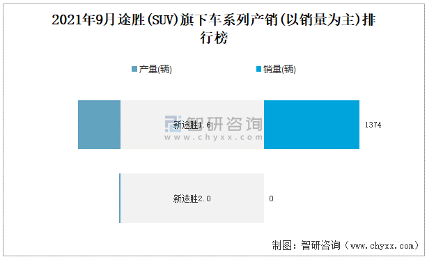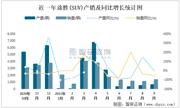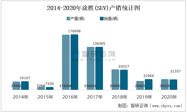 根據中國汽車工業協會數據可知:2021年9月途勝(SUV)產量為628輛,同比下降0%,銷量為1374輛,同比下降52.6%,當月產銷率為218.79%;2021年1-9月途勝(SUV)累計產量為16018輛,同比下降9.5%,累計銷量為17365輛,同比下降17.5%,累計產銷率為108.41%;2014-2020年途勝(SUV)產銷量均在2016年達到最高值,此后銷量逐年遞減,且近7年總銷量大于總產量,清倉庫存5782輛。