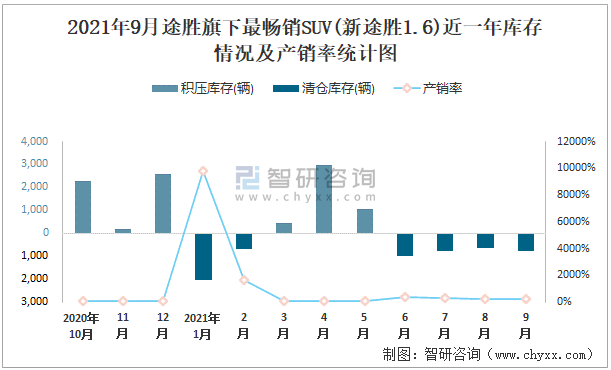 2021年9月途勝旗下最暢銷SUV(新途勝1.6)近一年庫存情況及產銷率統計圖
