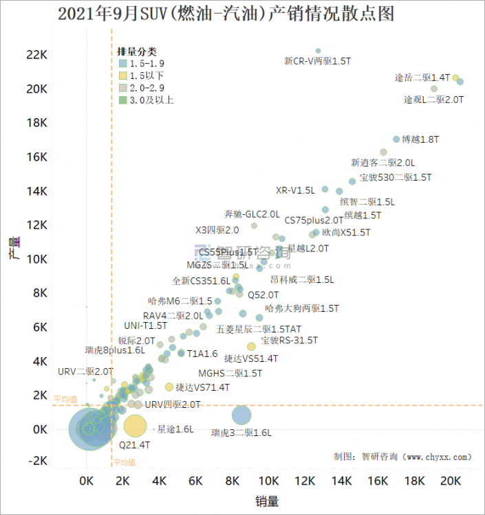 從下圖散點圖可看出,以產銷平均值作為四象限分界線,大部分燃油SUV集中在第一象限,即產多銷多,新CR-V兩驅1.5T產量這款SUV9月產量躍居第一;第三象限和第四象限SUV,其產銷率較高(散點大小代表了產銷率),說明大量產銷量不理想的SUV將庫存清理作為主要任務,銷量排名靠前的SUV,以1.5-1.9和2.0-2.9排量為主。