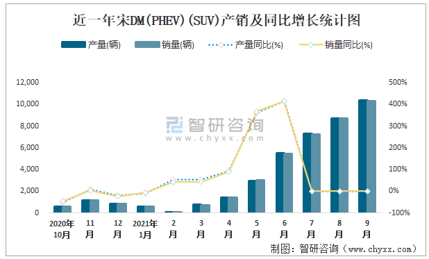 2021年9月宋DM(PHEV)(SUV)產銷量分別為10380輛和10278輛 當月產銷率為99.02%