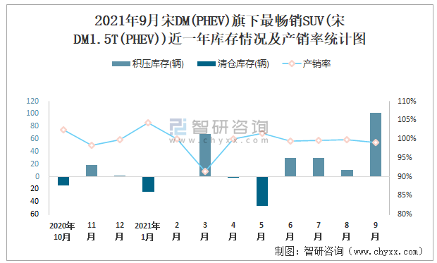 2021年9月宋DM(PHEV)旗下最暢銷SUV(宋DM1.5T(PHEV))近一年庫存情況及產銷率統計圖
