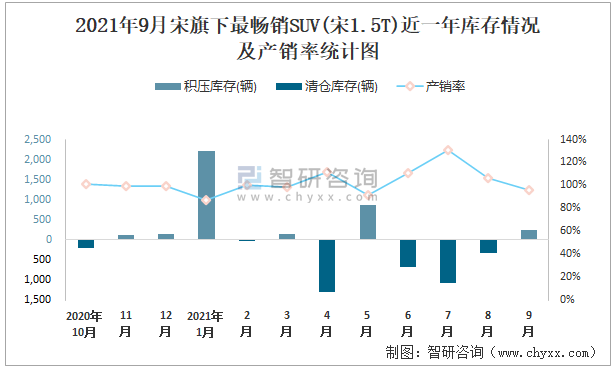 2021年9月宋旗下最暢銷SUV(宋1.5T)近一年庫存情況及產銷率統計圖