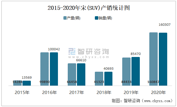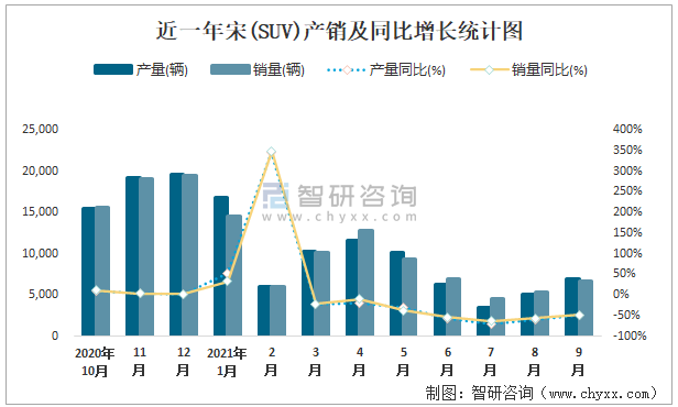 根據中國汽車工業協會數據可知:2021年9月宋(SUV)產量為6887輛,同比下降48.3%,銷量為6634輛,同比下降48.4%,當月產銷率為96.33%;2021年1-9月宋(SUV)累計產量為76471輛,同比下降28.3%,累計銷量為76418輛,同比下降28%,累計產銷率為99.93%;2015-2020年宋(SUV)產銷量2018年起逐年遞增,且近6年總產量大于總銷量,積壓了庫存544輛。