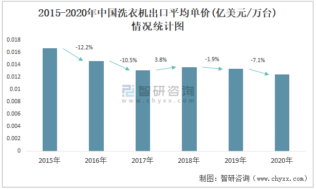 2015-2020年中國洗衣機出口平均單價(億美元/萬臺)情況統計圖