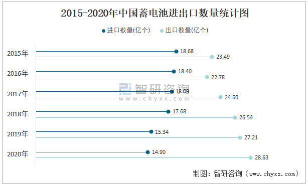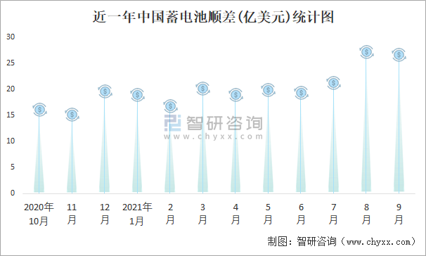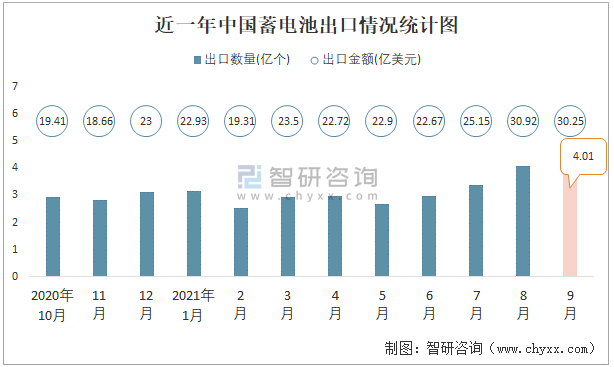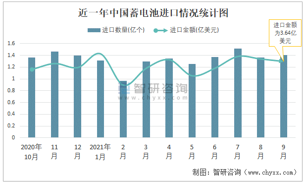 根據中國海關數據顯示:2021年9月中國蓄電池進口數量為1.41億個,同比下降4.7%,進口金額為3.64億美元,同比增長4.8%,2021年9月中國蓄電池出口數量為4.01億個,同比增長29.8%,出口金額為30.25億美元,同比增長52.8%;2021年1-9月中國蓄電池進口數量為11.83億個,進口金額為31.08億美元,出口數量為28.76億個,出口金額為220.26億美元。