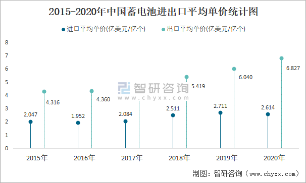 2015-2020年中國蓄電池進出口平均單價統計圖