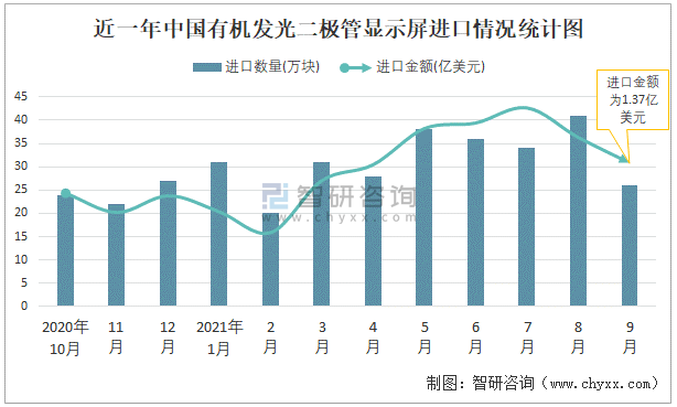 根據中國海關數據顯示:2021年9月中國有機發光二極管顯示屏進口數量為26萬塊,同比增長13.1%,進口金額為1.37億美元,同比增長43.9%,2021年9月中國有機發光二極管顯示屏出口數量為57萬塊,同比增長36.6%,出口金額為3.52億美元,同比增長74.3%;2021年1-9月中國有機發光二極管顯示屏進口數量為273萬塊,進口金額為12.22億美元,出口數量為427萬塊,出口金額為24.38億美元。