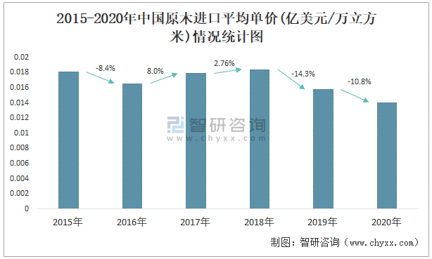 2015-2020年中國原木進口平均單價(億美元/萬立方米)情況統(tǒng)計圖