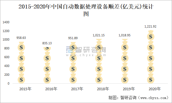 2015-2020年中國自動數據處理設備順差(億美元)統計圖