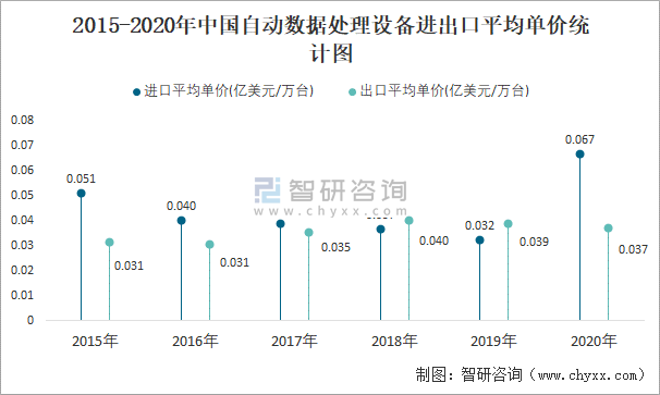 2015-2020年中國自動數據處理設備進出口平均單價統計圖