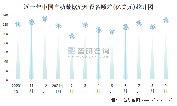 近一年中國自動數據處理設備順差(億美元)統計圖