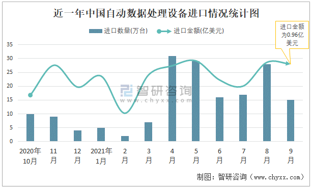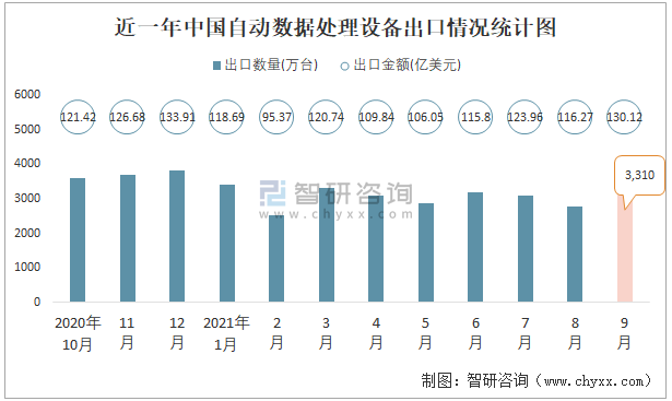 根據中國海關數據顯示:2021年9月中國自動數據處理設備進口數量為15萬臺,同比增長26.1%,進口金額為0.96億美元,同比增長26.8%,2021年9月中國自動數據處理設備出口數量為3310萬臺,同比下降1.9%,出口金額為130.12億美元,同比增長10.3%;2021年1-9月中國自動數據處理設備進口數量為150萬臺,進口金額為7.31億美元,出口數量為27581萬臺,出口金額為1036.82億美元。