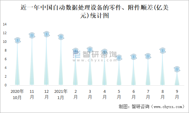 根據中國海關數據顯示:近一年中國自動數據處理設備的零件、附件進口金額總體小于出口金額,進出口貿易全部為順差,順差規模在9月有所縮減。