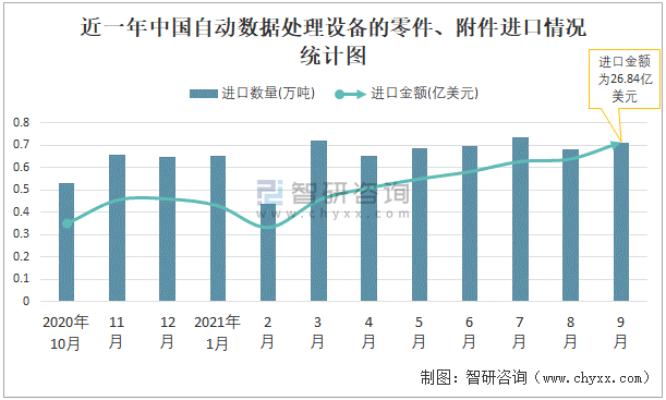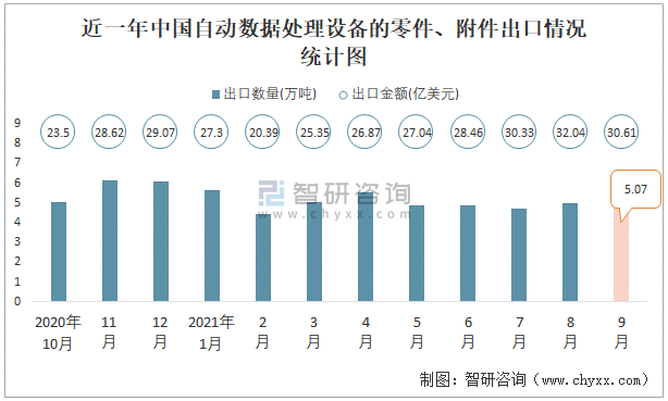 根據中國海關數據顯示:2021年9月中國自動數據處理設備的零件、附件進口數量為0.71萬噸,同比增長0.7%,進口金額為26.84億美元,同比增長17.6%,2021年9月中國自動數據處理設備的零件、附件出口數量為5.07萬噸,同比下降5.5%,出口金額為30.61億美元,同比增長9.5%;2021年1-9月中國自動數據處理設備的零件、附件進口數量為5.98萬噸,進口金額為181.99億美元,出口數量為45.17萬噸,出口金額為248.37億美元。