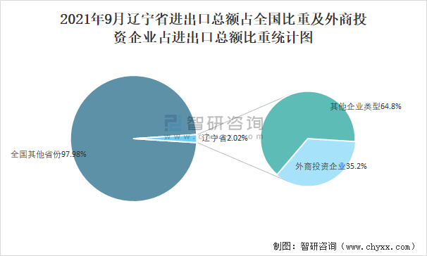 2021年9月遼寧省進出口總額占全國比重及外商投資企業(yè)占進出口總額比重統(tǒng)計圖