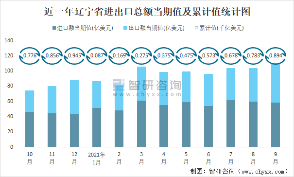 近一年遼寧省進出口總額當期值及累計值統(tǒng)計圖