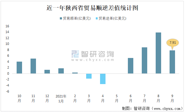 近一年陜西省進出口近4個月均呈現貿易順差狀態,2021年9月陜西省進出口貿易差值為7.91億美元。2021年9月陜西省進出口總額占全國比重為1.15%,相較于其他類型的企業,其中陜西省外商投資企業進出口總額占進出口總額比重為59.89%。