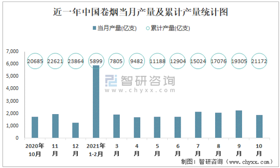 根據國家統計局數據顯示:2021年10月中國卷煙產量為1867億支,同比增長8.5%;2021年1-10月中國卷煙累計產量為21172.2億支,累計增長2.4%;2015-2020年中國卷煙產量2018年跌至最低,此后逐年遞增。