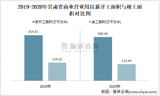 2019-2020年甘肅省商業(yè)營業(yè)用房新開工面積與竣工面積對比圖