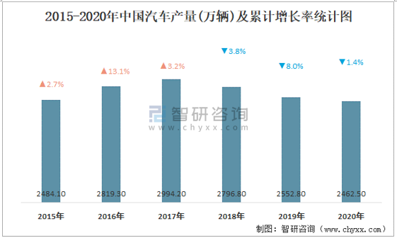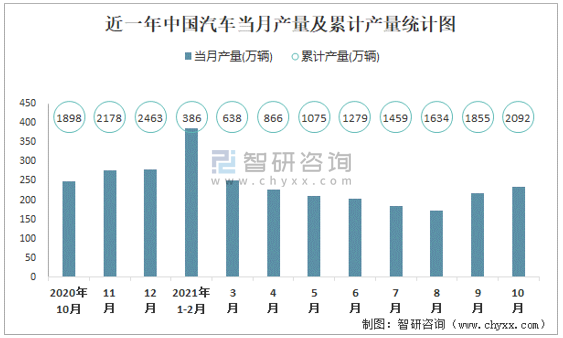 根據國家統計局數據顯示:2021年10月中國汽車產量為234萬輛,同比下降8.3%;2021年1-10月中國汽車累計產量為2091.7萬輛,累計增長7.1%;2015-2020年中國汽車產量2017年起逐年遞減。